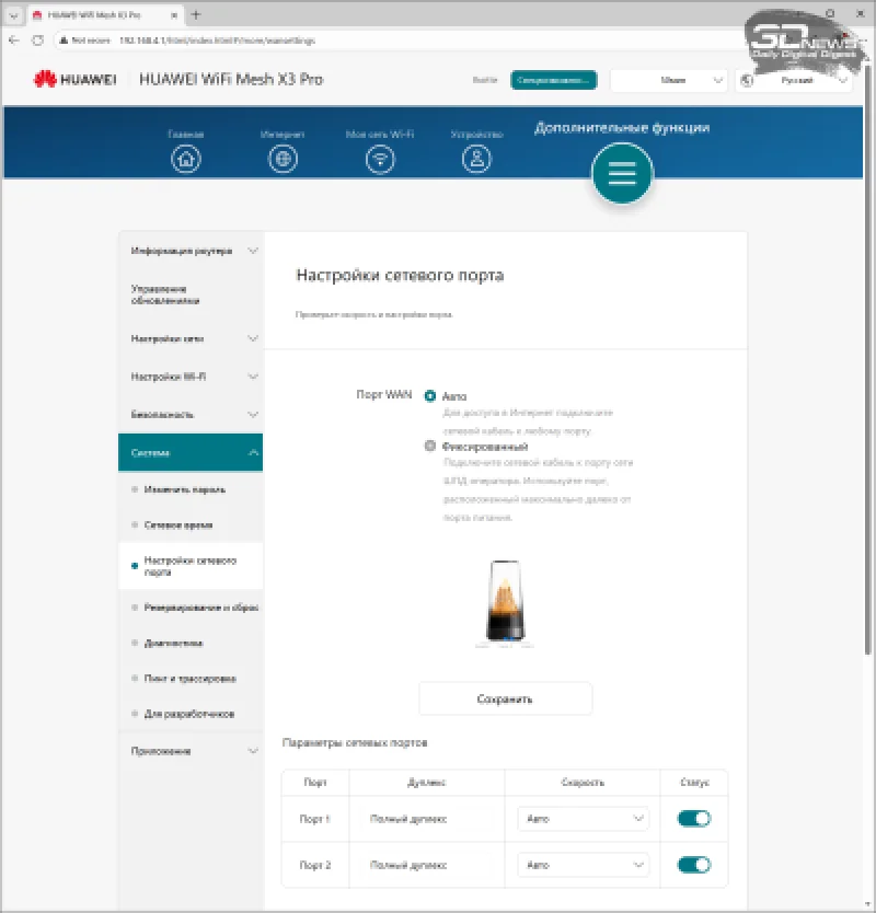 Основной маршрутизатор HUAWEI WiFi Mesh X3 Pro оборудован двумя портами 2.5GbE, каждый из которых может выполнять роль WAN-подключения, тогда как спутник имеет один порт GbE. Оба устройства используют активное охлаждение с практически бесшумными вентиляторами.