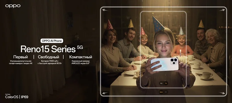 Бренд Oppo представил в России для покупки смартфоны Reno15 5G и Reno15 F. Главной особенностью новинок стала первая в своём роде 50-мегапиксельная фронтальная камера с ультрашироким углом обзора 100°, способная записывать видео в 4K при 60 кадрах в секунду. Это позволяет делать коллективные селфи, легко помещая в кадр всех друзей, а также запечатлевать больше элементов окружения. Кроме того, устройства отличаются мощным аккумулятором и интеллектуальными функциями на основе искусственного интеллекта.