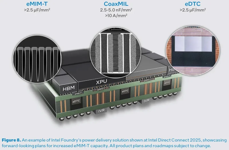 Ключевым конструктивным вызовом для многокристальных ускорителей ИИ и систем высокопроизводительных вычислений остается организация электропитания. Для этого платформа Intel должна интегрировать новейшие разработки компании в области энергоснабжения, такие как PowerVia, встроенные конденсаторы Omni MIM, развязку на уровне моста в EMIB-T, конденсаторы eDTC и eMIM-T на базовом кристалле, а также встроенные катушки CoaxMIL для поддержки полуинтегрированных регуляторов напряжения (IVR), размещаемых под каждым стеком и под корпусом (в отличие от решений TSMC CoWoS-L, где IVR являются частью интерпозера). Эта многослойная структура призвана обеспечивать стабильный ток в условиях рабочих нагрузок генеративного ИИ без просадок напряжения.