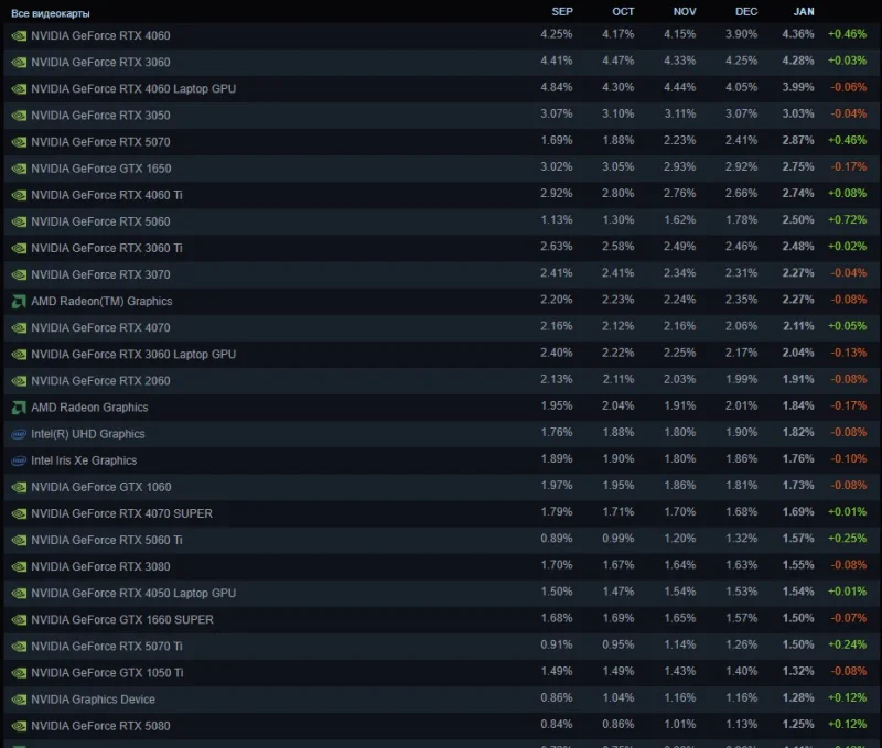 Более показательной является динамика роста популярности отдельных графических ускорителей. В январе наибольший прирост (0,72 п.п.) продемонстрировала RTX 5060. Эта карта среднего класса из серии Blackwell поднялась на восьмую строчку общего рейтинга, хотя другая новинка от Nvidia, RTX 5070, занимающая пятое место, остаётся более распространённой. Её доля среди пользователей платформы составила 2,87%, в то время как показатель RTX 5060 по итогам января достиг 2,50%.