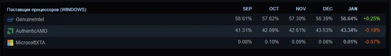 Согласно актуальной статистике, в январе процессоры AMD использовали 43,34% участников опроса на игровой платформе. Это означает снижение на 0,19 процентных пункта относительно декабря. Доля пользователей Intel, в свою очередь, выросла на 0,25 п.п., достигнув 56,64%.