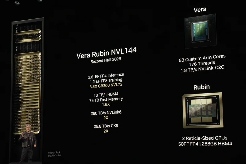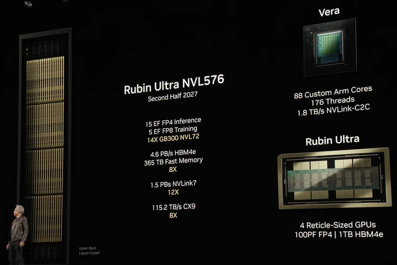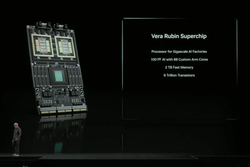 Каждый графический процессор Rubin включает два крупных кристалла с CUDA-ядрами и восемь модулей высокоскоростной памяти HBM4 суммарным объёмом 288 ГБ. Детальные параметры GPU, включая пропускную способность памяти, пока не раскрываются. При этом заявлено, что одиночная система Vera Rubin Superchip демонстрирует производительность в ИИ-вычислениях (FP4) до 100 Петафлопс, что эквивалентно 100 квадриллионам операций ежесекундно.