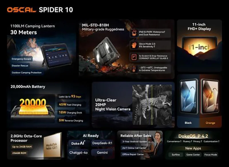 Бренд OSCAL приступил к международным продажам устойчивого планшета Spider 10, который выделяется не только повышенной стойкостью для эксплуатации в тяжёлых условиях, но и вместительным аккумулятором, а также камерой с ночным режимом, дающей возможность снимать круглосуточно.