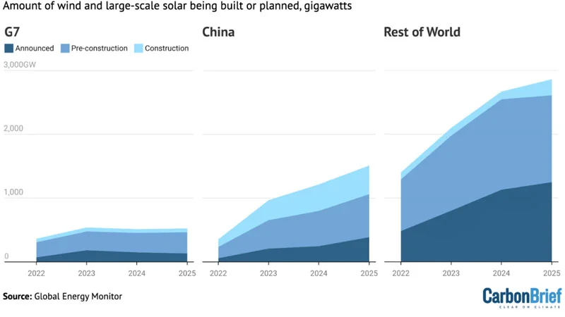 «Эпицентр развития чистой энергетики уверенно сместился в сторону стран с формирующимися рынками и развивающихся экономик. В 2025 году государства G7, при всём их финансовом могуществе, значительно отстали от Китая и остального мира по темпам ежегодного прироста мощностей», — отмечается в сообщении GEM.
