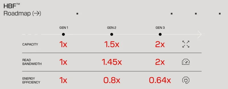 В планах SanDisk также приведены ориентировочные целевые значения скорости чтения для HBF второго (Gen2) и третьего (Gen3) поколений — более 2 ТБ/с и 3,2 ТБ/с соответственно — при ёмкости сборки до 1 ТБ и 1,5 ТБ, а также более скромные целевые показатели энергопотребления в сравнении с Gen1 — 0,8× и 0,64×. SK hynix и SanDisk не раскрыли сроков внедрения HBF, но уже назвали стандартизацию следующим этапом в рамках инициативы Open Compute Project.