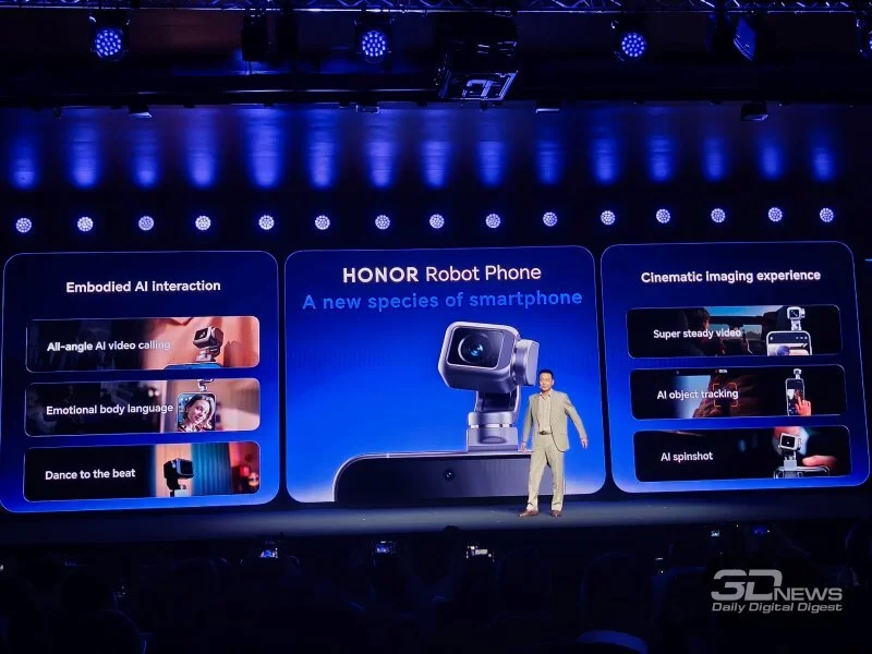 Honor показала Robot Phone на одной площадке с небольшим человекоподобным роботом. Подробностей об этом роботе представлено не было, хотя ранее компания уже анонсировала намерения вывести подобные продукты на коммерческий рынок.
