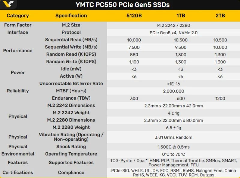 Устройства PC550 выпускаются в двух типоразмерах — M.2 2242 и M.2 2280, с допустимым температурным диапазоном от 0 ºC до 70 ºC. Заявленная производительность достигает 10 500 МБ/с при последовательном чтении и 10 000 МБ/с при последовательной записи.