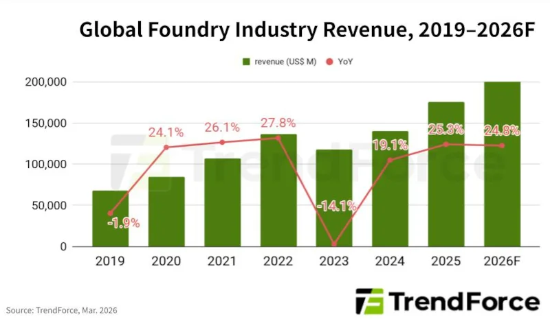 К 2026 году доходы глобального сектора полупроводникового контрактного производства увеличатся на 24,8% в годовом исчислении, достигнув 218,8 млрд долларов. Наиболее значительный рост прогнозируется у компании TSMC — приблизительно 32% в год. Этот подъём будет обусловлен потребностью в процессорах для искусственного интеллекта и сопутствующих чипах, а повышение стоимости уже затронуло технологические нормы 5/4 нм и более совершенные.