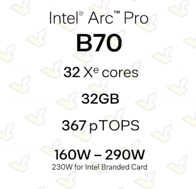 Кроме того, стало известно, что для Arc Pro B70 предусмотрен настраиваемый теплопакет (TDP) в диапазоне от 160 до 290 Вт, при эталонном значении в 230 Вт согласно спецификациям Intel. Конкретный уровень TDP будет определяться производителем карты. Примечательно, что даже максимальные 290 Вт остаются ниже показателя модели B60 Dual с двумя графическими процессорами, где TDP обычно достигает 400 Вт. Для Arc Pro B65 теплопакет составит 200 Вт, что соответствует значению Arc Pro B60. Хотя характеристики Arc Pro B65 и Arc Pro B60 во многом схожи, первая будет отличаться увеличенным объёмом памяти и более высокой её пропускной способностью.