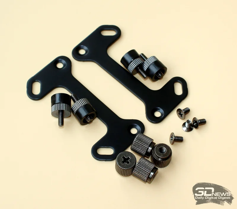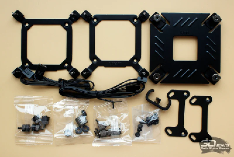 Комплектующие, входящие в набор поставки, размещены в отдельной небольшой коробке. В неё входят две металлические пластины и усиленная задняя панель для платформ Intel, две монтажные пластины для AMD, наборы винтов и втулок, а также пластиковый хомут для шлангов.