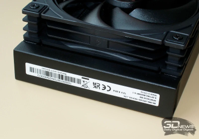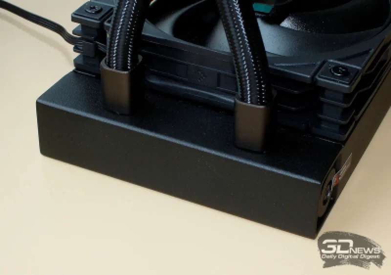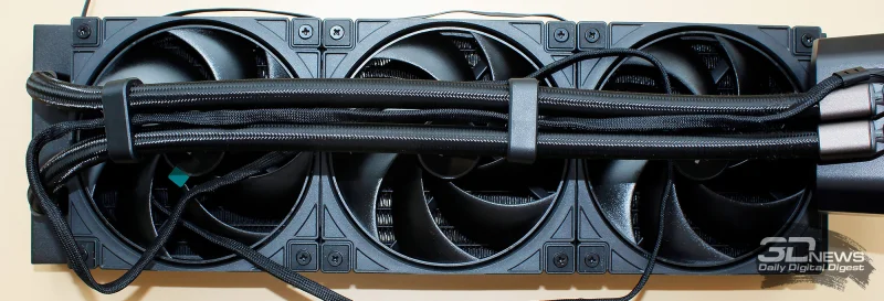 Вентиляторы соединяются между собой последовательно через четырёхконтактные разъёмы, аккуратно размещённые в углах рамок. Последний вентилятор подключается к кабелю длиной 600 мм, который ведёт к комплектному хабу Spartacus 360. Также стоит отметить, что вес одного такого вентилятора составляет всего 137 граммов, благодаря чему общая масса СЖО оказывается меньше, чем у других систем формата 360 мм.