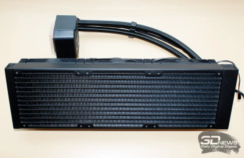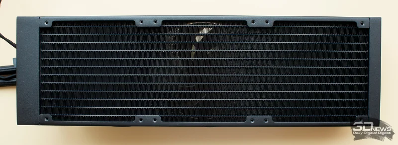Габариты алюминиевого радиатора составляют 402 × 120 × 27 мм, что близко к стандартным значениям, хотя его длина несколько превышает типичные показатели. При этом размеры активной зоны, включающей рёбра и жидкостные каналы, равны 361 × 117 × 20 мм.