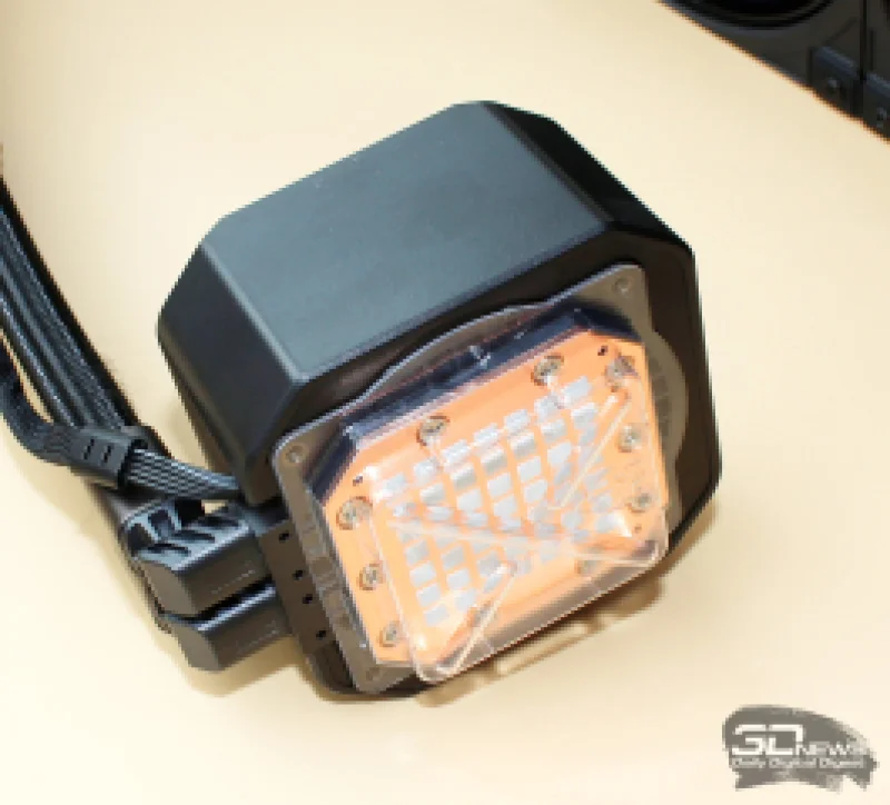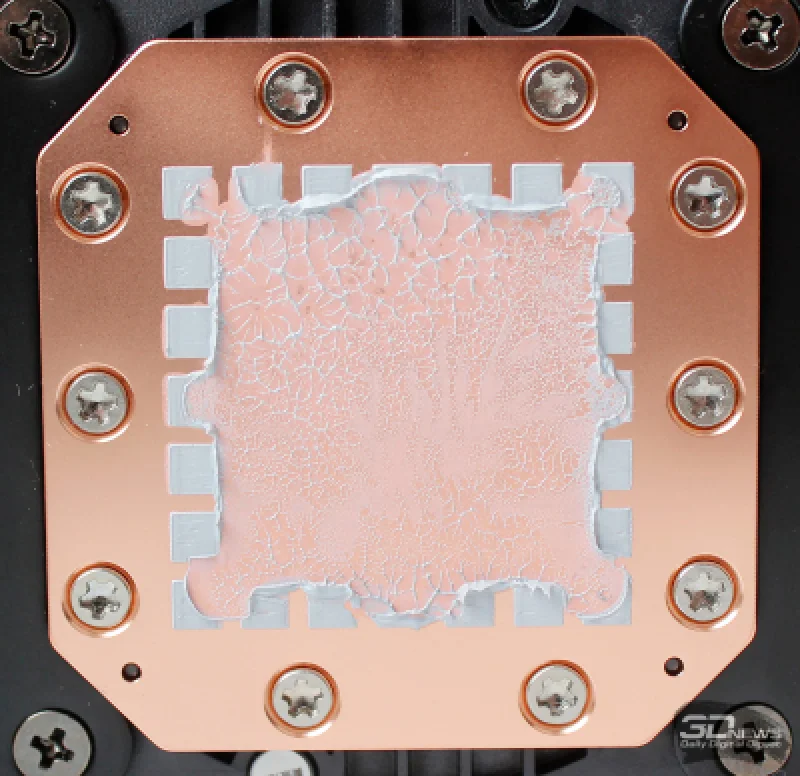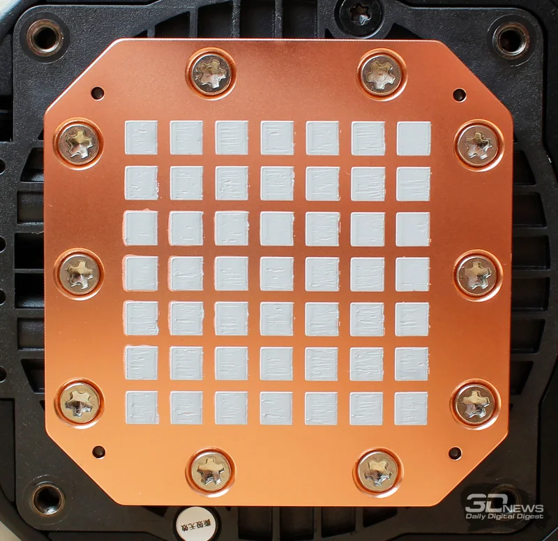 К основанию насоса при помощи десяти винтов крепится медный водоблок, имеющий микроканальную структуру. По всей видимости, в нём не применено никаких принципиальных новшеств по сравнению с более ранними СЖО от DeepCool, а расстояние между рёбрами осталось прежним — 0,1 мм. Площадь контактной поверхности водоблока составляет 54 × 54 мм, и на неё уже нанесён термоинтерфейс серого оттенка.