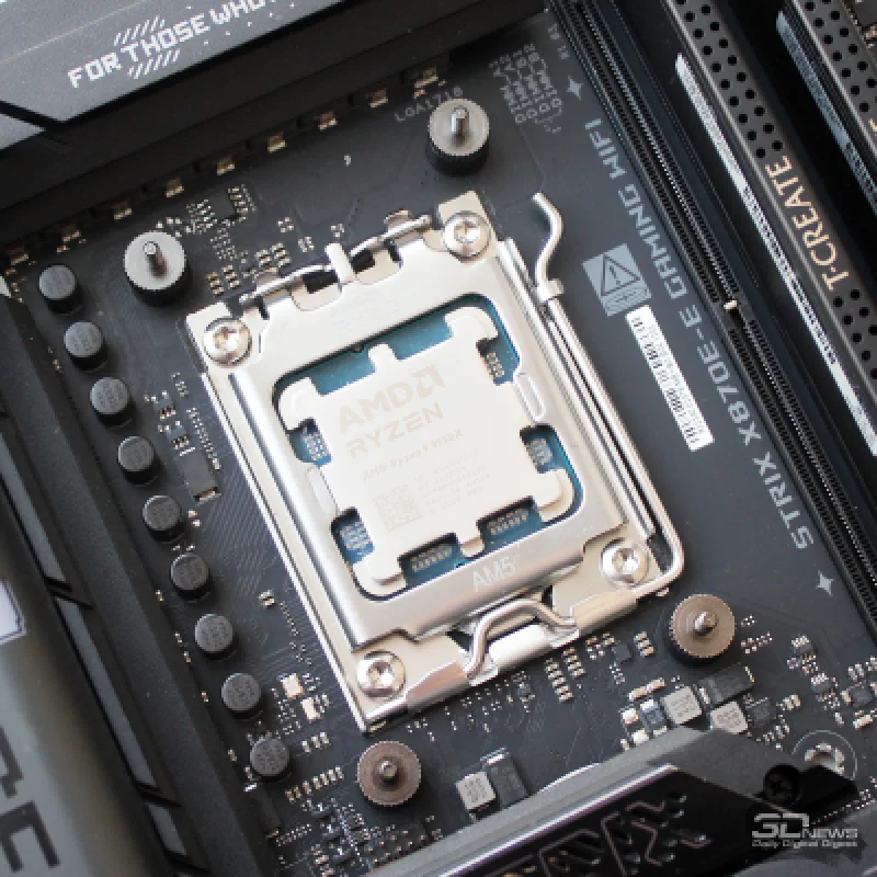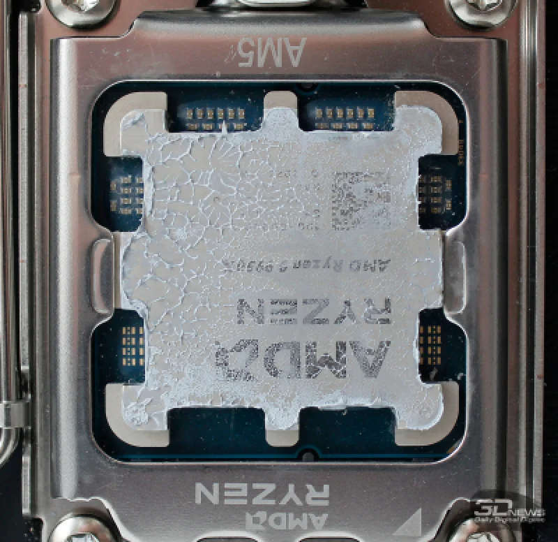Поверхность теплораспределителя отличается ровностью и качественной полировкой; оттиск на теплораспределительной крышке процессора AMD для платформы Socket AM5 получился равномерным по всей зоне контакта.