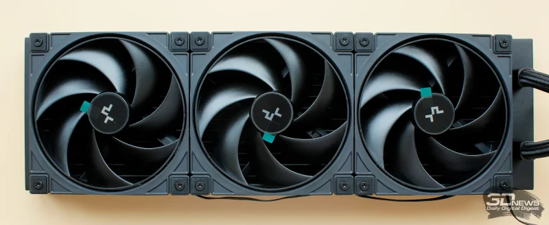 Первым по-настоящему значимым и заметным отличием модели Spartacus 360 от предыдущих систем жидкостного охлаждения DeepCool стала тройка новых 120-миллиметровых вентиляторов FD12 V2 с крыльчаткой оригинальной конструкции. Компания постоянно работает над совершенствованием вентиляторов для своих систем охлаждения, и, судя по всему, в данной СЖО удалось найти оптимальный баланс между эффективностью и тишиной работы.