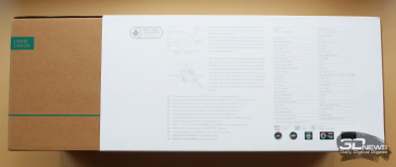DeepCool придерживается единого стиля в оформлении упаковки своей продукции: это лаконичные коробки в терракотовых тонах, обрамлённые белой полосой. На лицевой стороне размещено изображение системы, а на тыльной — перечень её технических параметров.