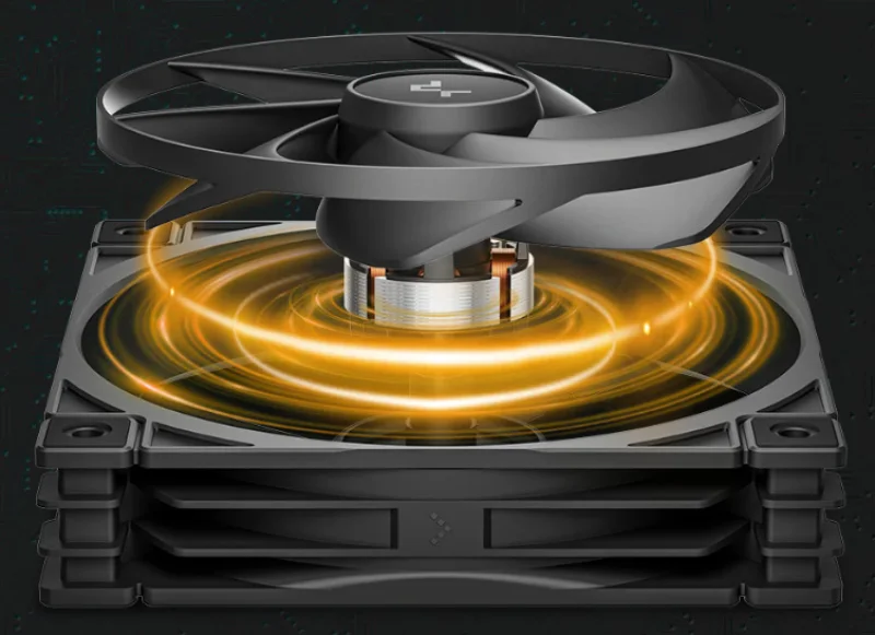 Подобная конструкция обеспечивает вентилятору тихую работу, а частично открытые края способствуют снижению потерь в воздушном потоке и статическом давлении. В прошлых тестах моделей с замкнутым ободом на лопастях мы уже обращали внимание на их действительно негромкое звучание, однако воздушный поток у них был слабым, а статическое давление — разочаровывающе низким. В данном случае инженеры DeepCool применили внешний обод шириной всего 5 мм, в то время как остальная часть лопастей функционирует аналогично традиционным вентиляторам.