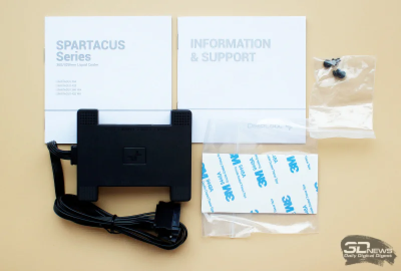 Помимо этого, в коробке присутствуют руководство по монтажу, гарантийный талон, контроллер для управления и мониторинга с крепёжными винтами и скотчем 3M. Отсутствие отдельного тюбика с термопастой не должно смущать — она уже нанесена на контактную поверхность водоблока.