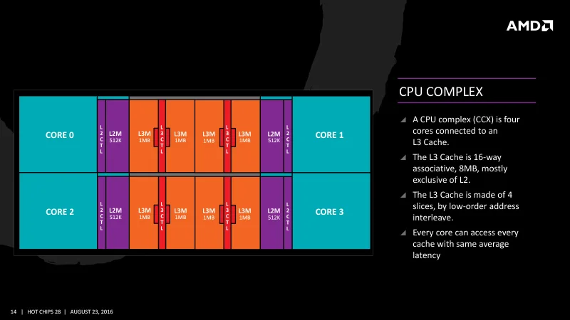 В архитектуре Zen 2 инженеры сосредоточились на преодолении одного из главных ограничений предыдущих поколений, уделив особое внимание повышению скорости работы с памятью. Контроллер памяти теперь поддерживает стандарт DDR4-3200, была увеличена пропускная способность основной внутрипроцессорной шины Infinity Fabric, а также вдвое расширен объём кеша третьего уровня — до 16 МБ на каждую группу из четырёх ядер. Однако структура вычислительных комплексов CCX осталась прежней. В восьмиядерном чиплете CCD, как и раньше, размещались два независимых четырёхъядерных блока с изолированной кеш-памятью, не имеющие прямой связи между собой. Из-за этого процессоры на базе Zen 2 по-прежнему демонстрировали высокую задержку при взаимодействии ядер.