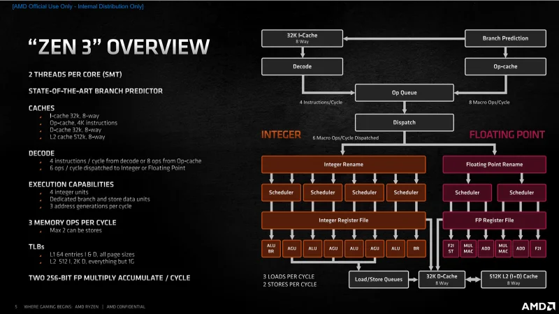 Однако изменения не ограничились лишь перестройкой структуры CCX. Инженеры также модернизировали внутреннюю организацию самих ядер. В Zen 3 был усовершенствован предсказатель ветвлений, оптимизированы механизмы предвыборки инструкций, а также увеличены размеры внутренних буферов и очередей выполнения. Параллельно была повышена пропускная способность модуля вычислений с плавающей запятой, а подсистема памяти получила возможность обрабатывать больше операций чтения и записи за такт — до трёх 256-битных операций чтения или двух 256-битных операций записи. Все эти улучшения способствовали росту удельной производительности: согласно заявлениям AMD, прирост IPC в Zen 3 составил около 19% по сравнению с Zen 2.