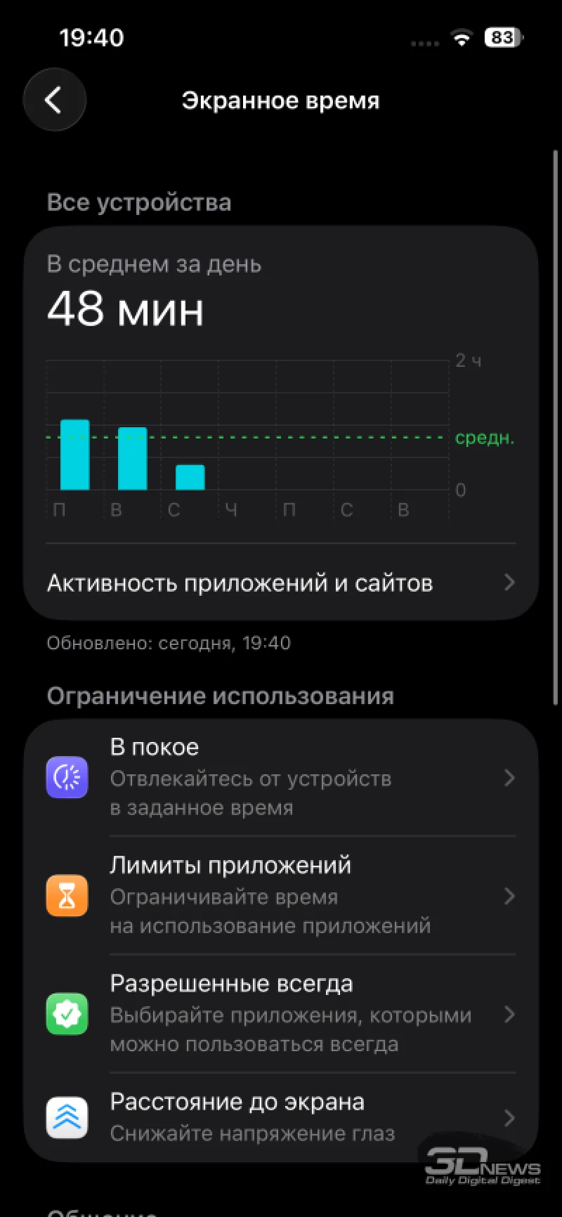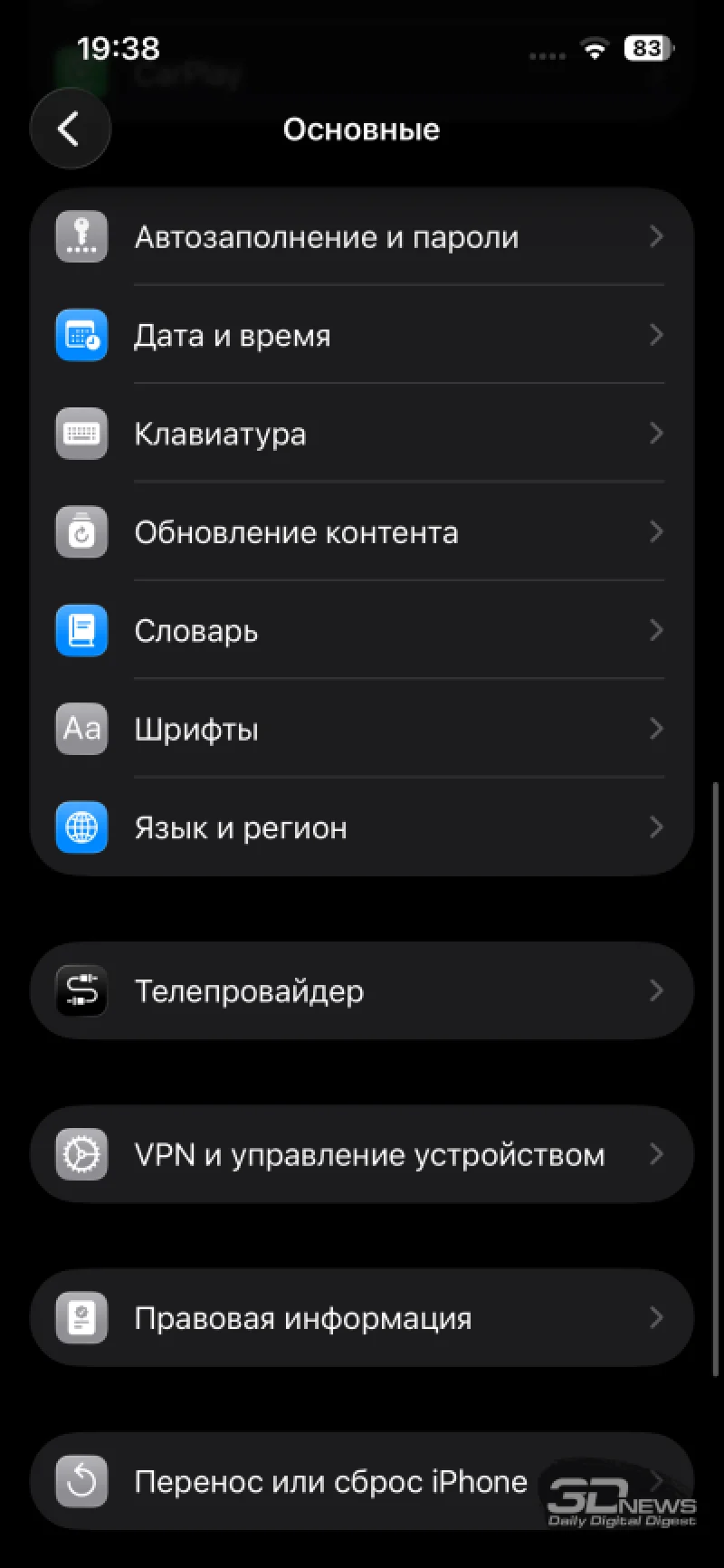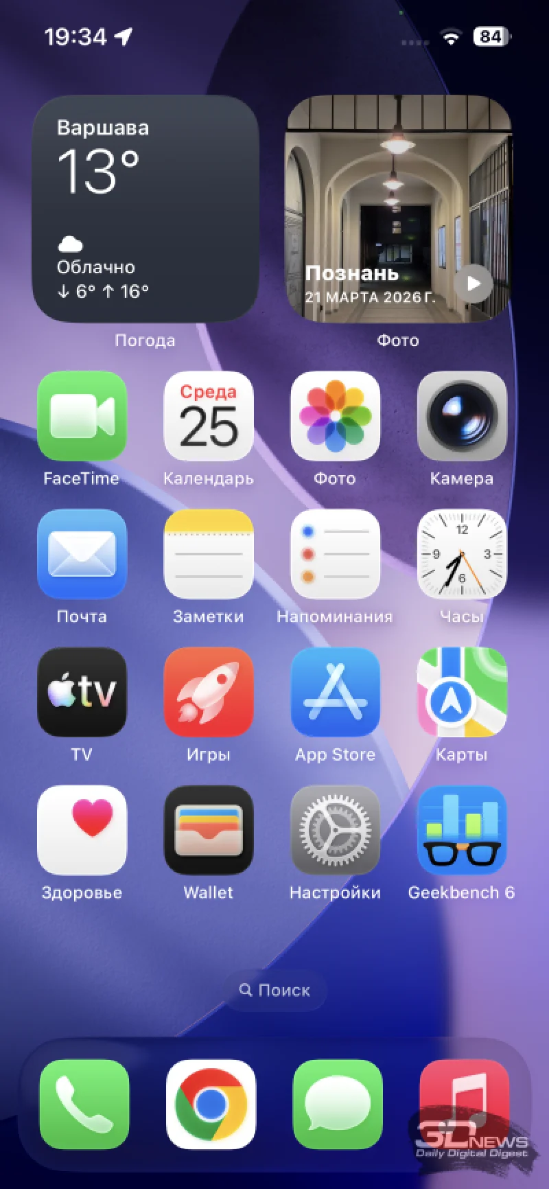 Параметры яркости также остались прежними. Пиковая яркость при воспроизведении HDR-контента заявлена на отметке 1200 кд/м². В ручном режиме максимум достигает 800 кд/м². По нынешним стандартам это не рекордный показатель, но стоит отметить, что даже в яркий солнечный день экран демонстрирует себя достойно, обеспечивая комфортное использование. Как и всегда в iPhone, здесь присутствует неизменяемая автоматическая регулировка яркости, которая работает очень точно — в ходе тестирования не возникало необходимости вручную корректировать уровень подсветки.
