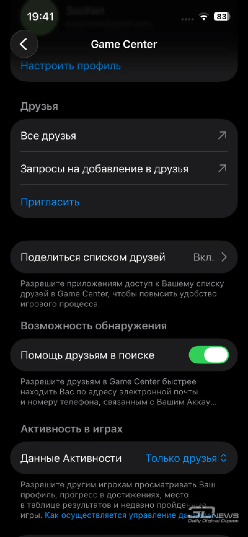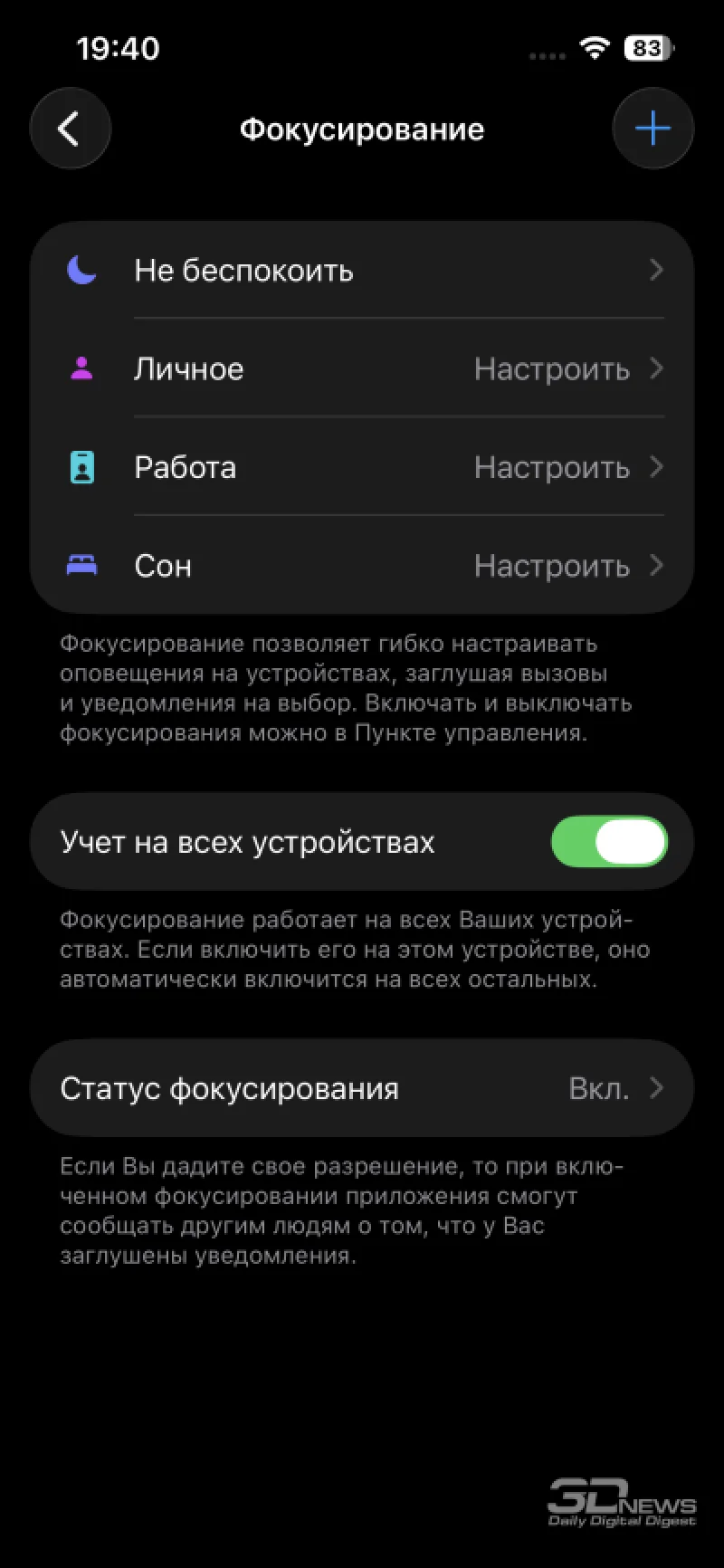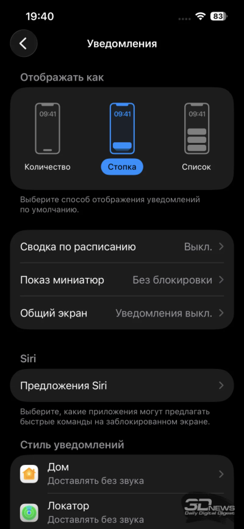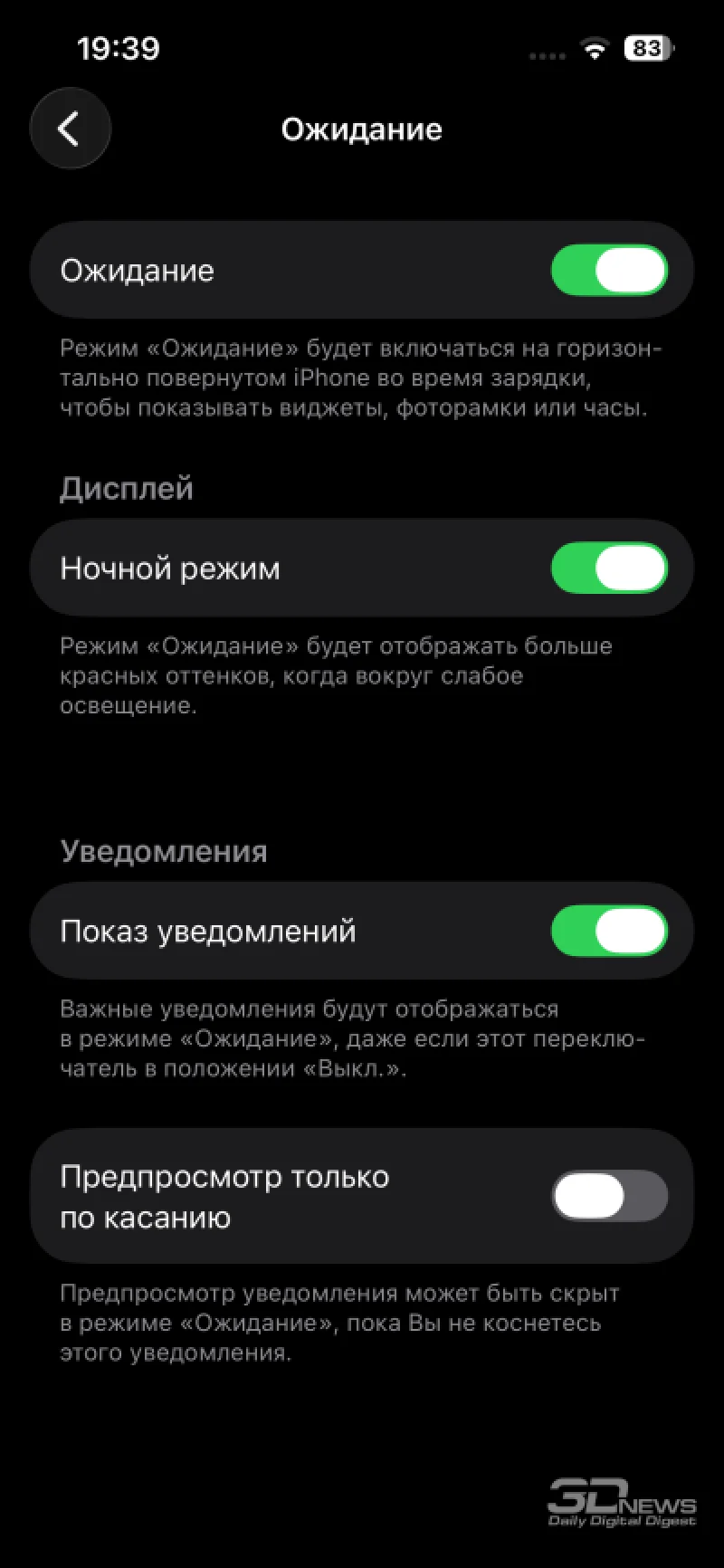 В разделе параметров экрана сохраняется возможность ручного выбора светлой или тёмной темы, а также активации их автоматической смены в зависимости от времени дня. Пользователь может настроить размер шрифта и общий масштаб интерфейса, в том числе включить более насыщенное начертание текста. Хотя ручная коррекция цветов не доступна, присутствует технология True Tone, автоматически подстраивающая цветопередачу под окружающее освещение — её при желании можно деактивировать. Функция Night Shift плавно смещает отображение в тёплую гамму в вечерние и ночные часы. Для неё можно задать график работы и интенсивность эффекта. Также остаётся опция «Масштаб», которая увеличивает элементы интерфейса.