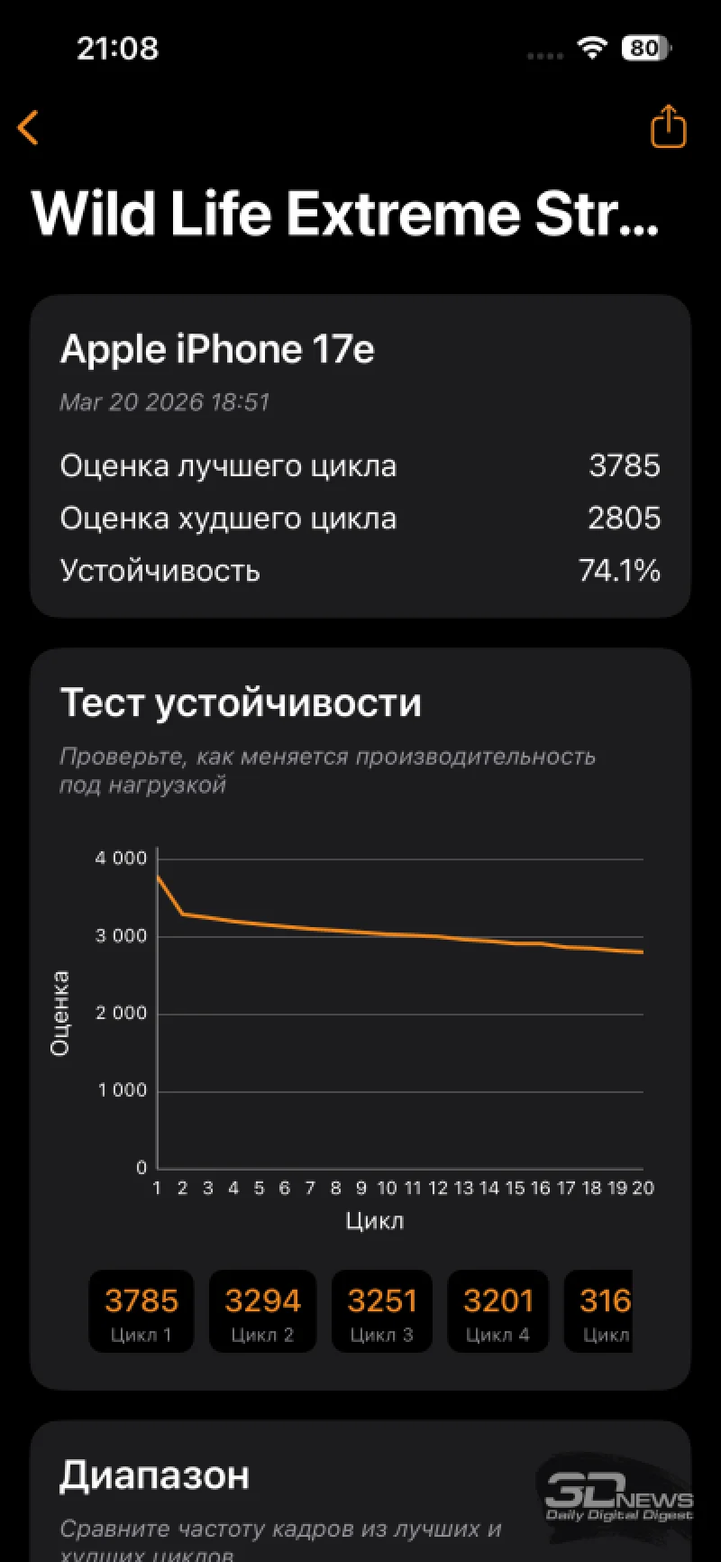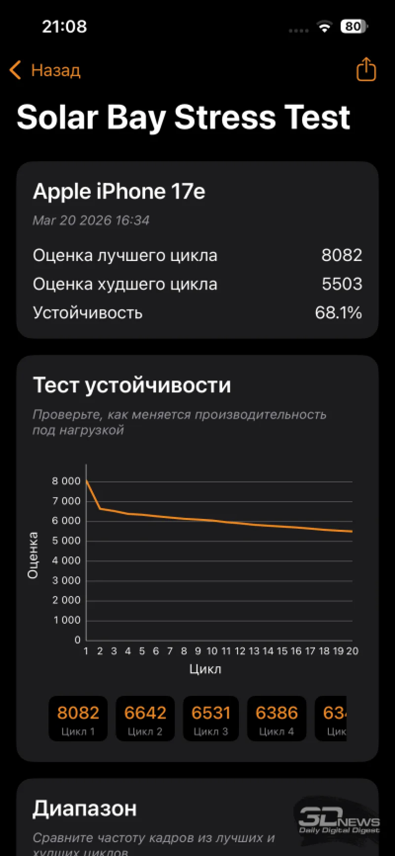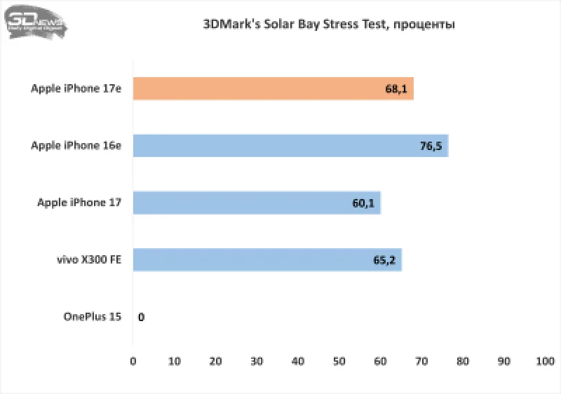 Все современные iPhone склонны к нагреву при длительной нагрузке, и iPhone 17e не является исключением из этой спорной тенденции. В таких условиях чипсет снижает тактовые частоты, что приводит к падению производительности. В стресс-тестах 3DMark снижение достигло 31,9% в наиболее требовательном Solar Bay — это лучше, чем у iPhone 17 (здесь играет роль изначально менее мощный GPU), но хуже, чем у iPhone 16e. По сравнению с аналогами iPhone 17e демонстрирует достойные результаты в ресурсоёмких тестах.