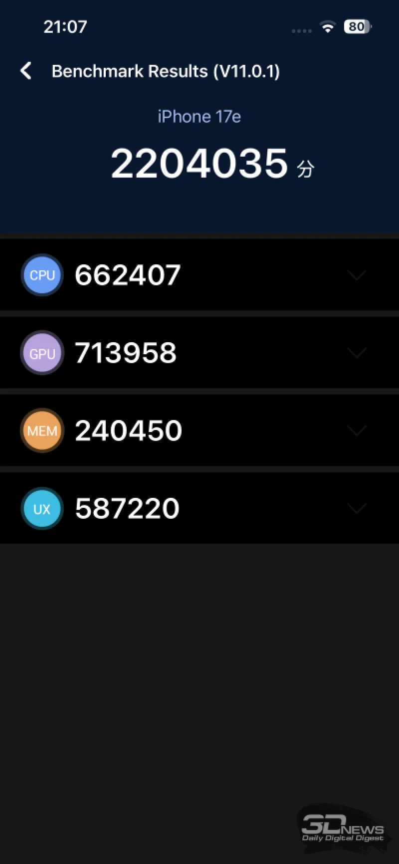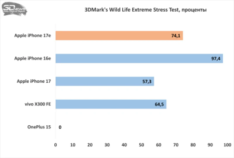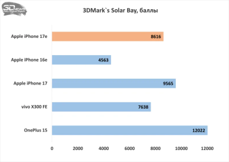 Что касается графических возможностей, которые обычно оцениваются с помощью бенчмарков 3DMark, то здесь отчётливо видна разница между аппаратными платформами iPhone 17e и iPhone 17. Тем не менее, графический процессор всё равно значительно превосходит предыдущее поколение, хотя и отстаёт от флагманского решения Qualcomm.