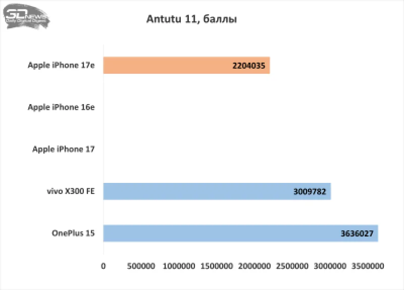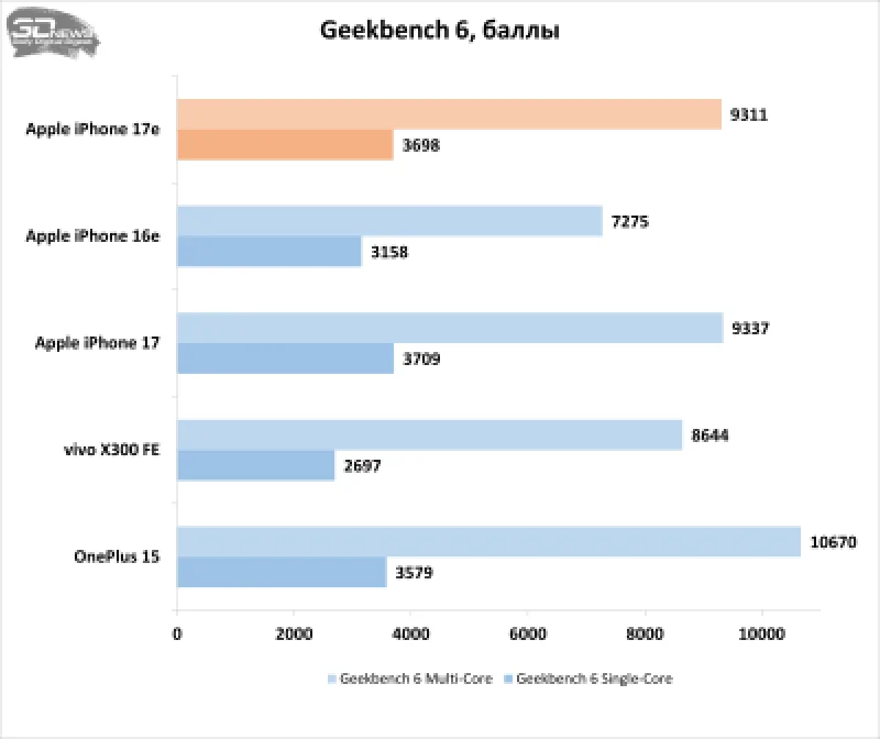 Центральный процессор, как и предполагалось, показывает производительность, близкую к уровню iPhone 17. Также стоит отметить, что CPU значительно превосходит своего предшественника в чипе Apple A18 Bionic. В сравнении с Android-устройствами, в тесте Geekbench 6 чип от Apple обгоняет субфлагманский Snapdragon 8 Gen 5, но отстаёт от флагманского Snapdragon 8 Elite Gen 5. Комплексный бенчмарк AnTuTu 11 выявил у iPhone 17e заметное снижение оценки за работу с памятью, хотя и по остальным параметрам он показывает результаты ниже, чем конкуренты.