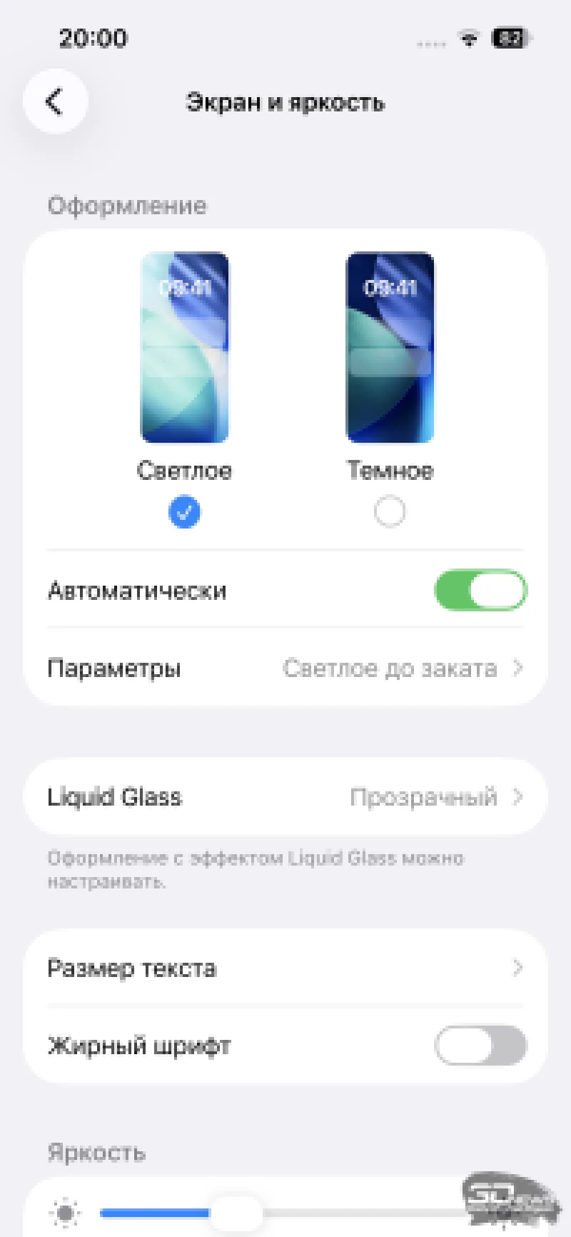 Настройки экрана в iPhone 17e практически не изменились — добавился лишь пункт Liquid Glass, позволяющий выбрать между «прозрачными» или «сплошными» элементами интерфейса. Во втором случае «стекло» приобретает матовый эффект, частично возвращая интерфейс к стилю предыдущих версий iOS, хотя и не полностью.