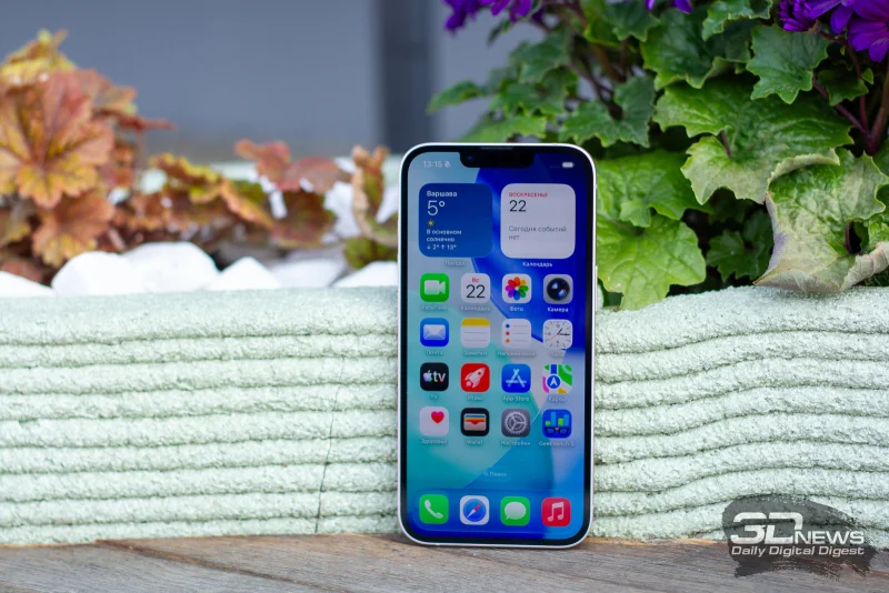 Фронтальная часть устройства практически не отличается от дизайна iPhone 14, выпущенного три с половиной года назад: здесь присутствует довольно крупная «чёлка» для селфи-камеры и датчиков Face ID. Я по-прежнему считаю, что столь массивный вырез в современном смартфоне смотрится устаревше — хотя и «динамический остров» в старших моделях айфонов, на мой взгляд, ненамного лучше. Экран по нынешним меркам довольно компактный — 6,1 дюйма, то есть меньше, чем у iPhone 17.