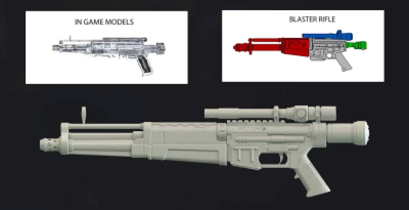 Другие изображения представляют модели виброклинков, бластерной винтовки, различных предметов и деталей окружения. Некоторые объекты создавались для начальной локации, а оружие разрабатывалось с модульной системой улучшений.