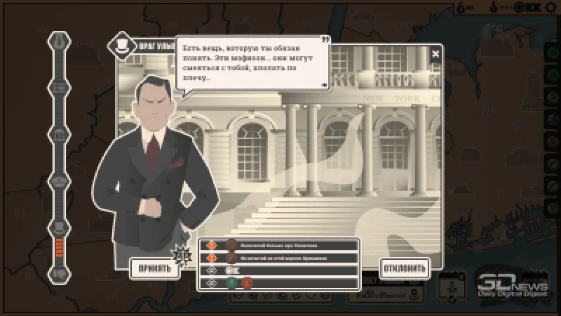 В иных случаях приходится избегать определённых сюжетов, чтобы не вызвать недовольство какой-либо группировки. На старте доступно лишь сотрудничество с районной мафией — её представителей раздражают политические репортажи, зато они ценят, когда о них пишут в позитивном или хотя бы нейтральном ключе. Примите предложение — и заработаете очки влияния, которые пригодятся для упомянутых ранее действий в других кварталах, а также пару сотен долларов, всегда полезных в деле. Откажетесь — на следующий день к вам наведаются крепкие ребята с дубинками.