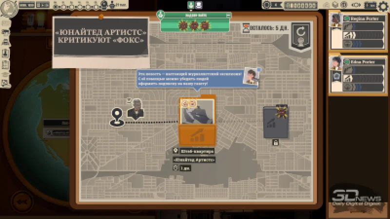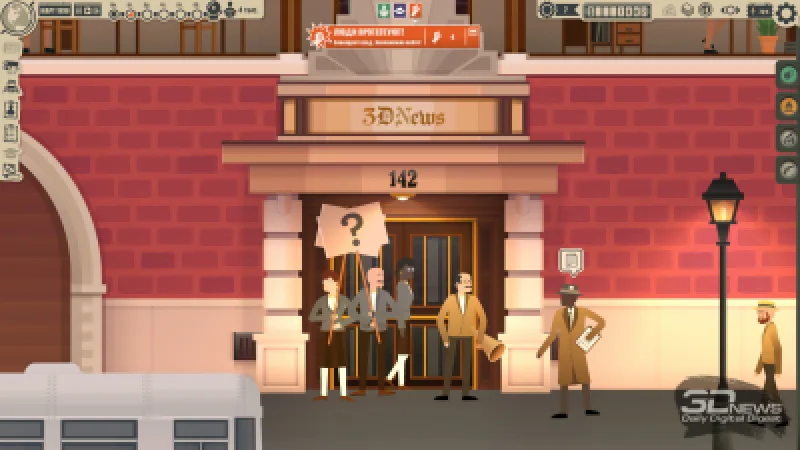 Да, в News Tower случается и такое — некоторые материалы добываются нелегко. Можно травмировать репортёра, который на несколько дней выбывает из строя, или столкнуться с судебным иском, если кто-то рассердится на ваше чрезмерное любопытство. Эти и многие другие механики игра вводит постепенно, из-за чего в News Tower легко «зависнуть» на несколько часов подряд — спокойная неделя, когда ничего особенного не происходит, может смениться семидневкой, полной новых сложных задач, которые интересно решать. Получив доступ к рекламному агентству, вы начинаете искать рекламодателей и задумываетесь о переходе с двух полос на три. В среду или четверг натыкаетесь на сенсацию — ставите игру на паузу, расставляете приоритеты, нанимаете дополнительного редактора и пытаетесь успеть подготовить материал к воскресенью. У входа собираются протестующие — идёте выбирать охранника, который их разгонит, иначе журналисты не смогут вернуться в редакцию.