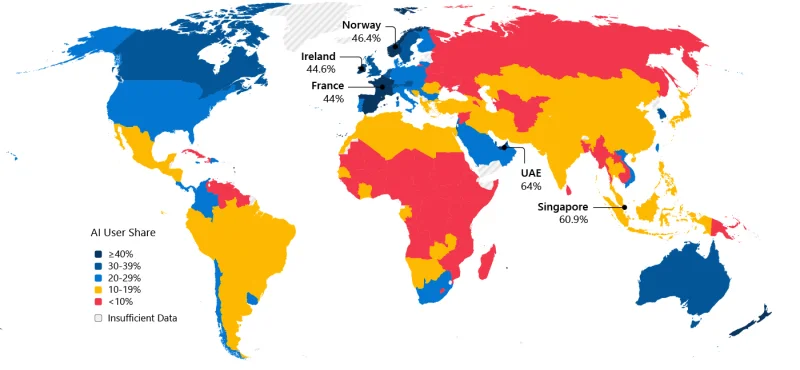 Эксперты отмечают, что технологическое лидерство не всегда коррелирует с массовым использованием ИИ среди населения. Наиболее передовые разработки в этой сфере создаются в США, где ИИ применяют 28,3% жителей, однако страна занимает лишь 24-ю строчку в списке. Особо выделяются достижения Южной Кореи, чей опыт доказал эффективность государственной политики в области ИИ: за полгода страна поднялась с 25-й на 18-ю позицию в мировом рейтинге — этому способствовали улучшенная поддержка корейского языка в ИИ-моделях и внедрение удобных пользовательских функций. Генеративный ИИ активно задействуется в образовательных учреждениях, на предприятиях и в государственных службах. Южная Корея превратилась в один из самых динамичных рынков для ChatGPT, что побудило OpenAI открыть офис в Сеуле.