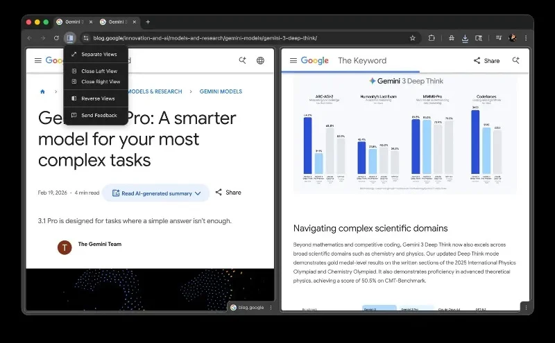 После этого под адресной строкой появится интерфейс с двумя панелями, а адрес в строке будет автоматически обновляться в зависимости от активной вкладки. Слева от строки адреса отобразится значок разделения; нажав на него, можно выбрать действия: «Разделить», «Закрыть» или «Поменять местами». Ширину каждой панели легко настроить, перетаскивая разделитель между ними. Такой режим может быть удобен во многих случаях, например, для параллельного просмотра ролика и ведения записей или для одновременной работы с видеозвонком и документом.