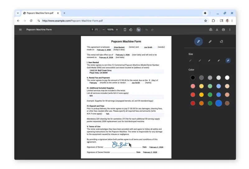 Встроенное в Chrome средство просмотра PDF теперь поддерживает добавление аннотаций. Пользователи могут выделять фрагменты текста и оставлять комментарии, нажав на соответствующий значок в верхней панели инструментов. На боковой панели справа доступны настройки размера и цвета текста. Это позволяет обойтись без скачивания файла и его открытия в сторонней программе лишь для того, чтобы сделать краткую пометку.