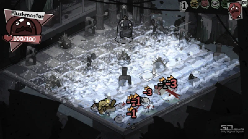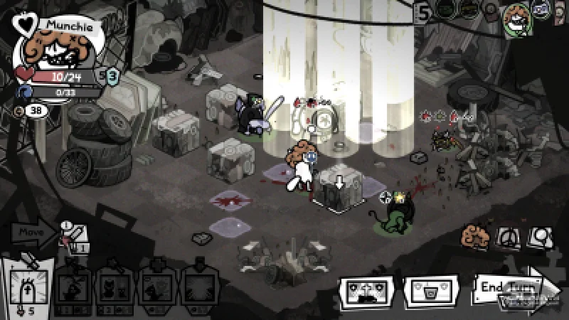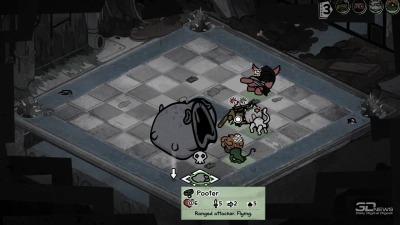 Например, в канализации вас ждут встречи с ужасными четырёхпалыми акулами и отвратительными пиявками, которые атакуют ваших котов с половины поля боя. Да и сами места сражений нередко заполнены опасными объектами: гарпунами, притягивающими любого проходящего мимо бойца, колючими валунами, наносящими дополнительный урон при соприкосновении, и… обильными следами деятельности пищеварительной системы. Последние, хоть и не угрожают котам напрямую, могут доставить неудобства вам лично — обилие коричневых кучек вызвало у меня заметную тошноту. Особенно когда из-за расстройства желудка (в ходе забега коты могут подхватить болезни) мой танк почти каждый ход устраивал «коричневый артобстрел».