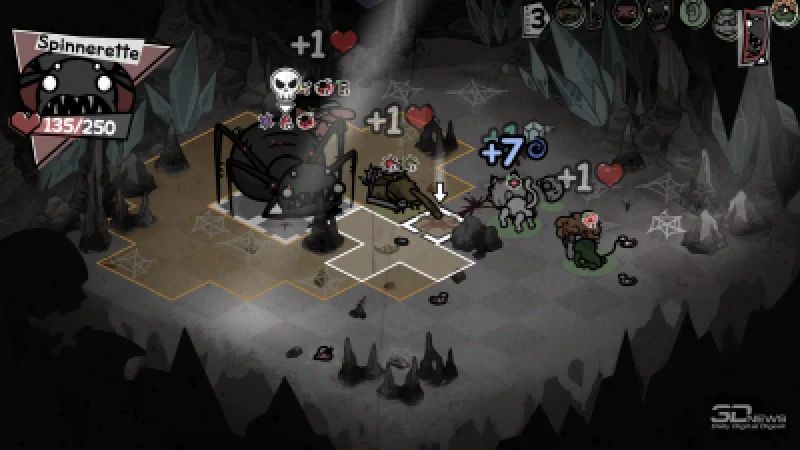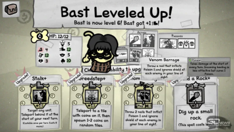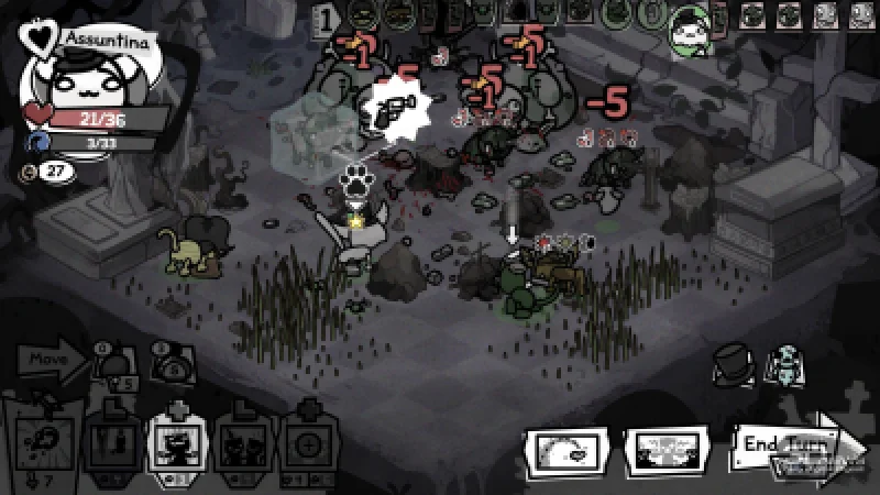После успешного сражения коты осваивают новые навыки (на выбор предлагается четыре варианта). Одни из них ценны своей универсальностью: например, умения, повышающие урон, призывающие фамильяров, позволяющие перемещаться по полю боя, усиливающие или исцеляющие союзников. Другие же носят ситуативный характер — они способны переломить ход тяжёлой битвы, но могут и остаться бесполезными, а иногда даже привести к гибели всей команды. К примеру, это мощная атака по площади, затрагивающая и друзей, и врагов, или особый эффект, снижающий урон от обычной атаки вдвое, но дающий дополнительное действие; или пассивный навык охотника, когда после выстрела стрелок разворачивается на 180 градусов и производит повторный залп по ближайшей цели… включая союзников. Подобные умения обладают потенциалом, однако подходят далеко не для любого состава и не для каждой схватки.