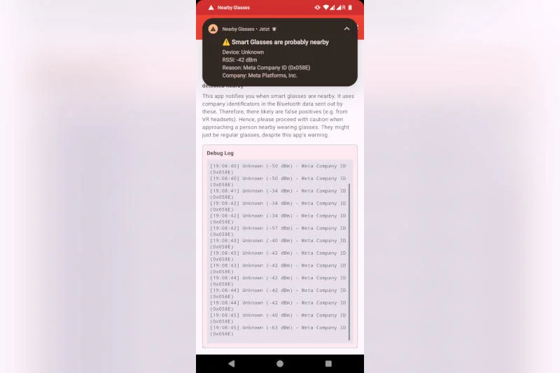 Преподаватель Дармштадтского университета прикладных наук (Германия) Ив Жанрено (Yves Jeanrenaud) создал и выложил в открытый доступ приложение Nearby Glasses для Android. Эта программа анализирует широковещательные сигналы Bluetooth Low Energy (BLE) с целью обнаружения уникальных идентификаторов, характерных для умных очков с искусственным интеллектом Ray-Ban Meta✴.