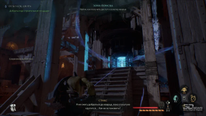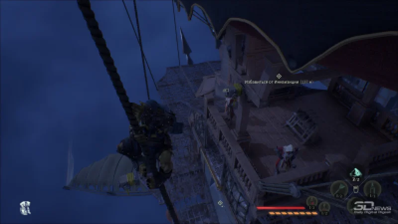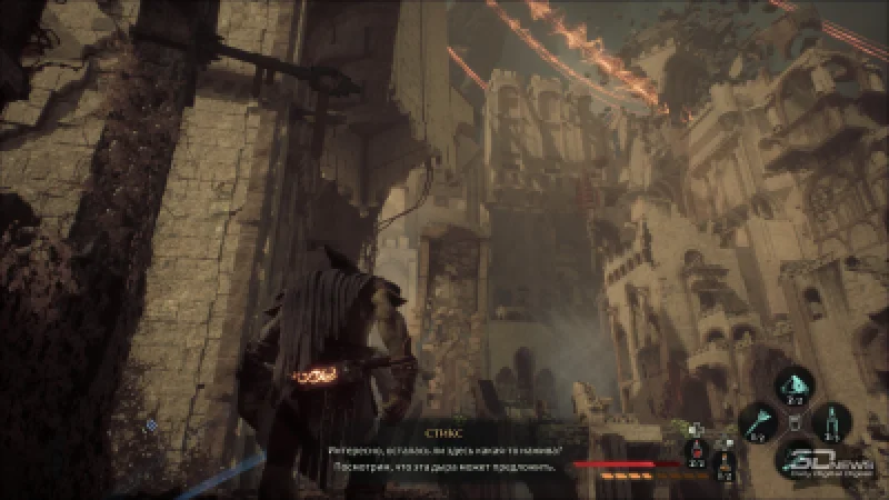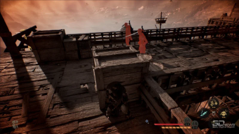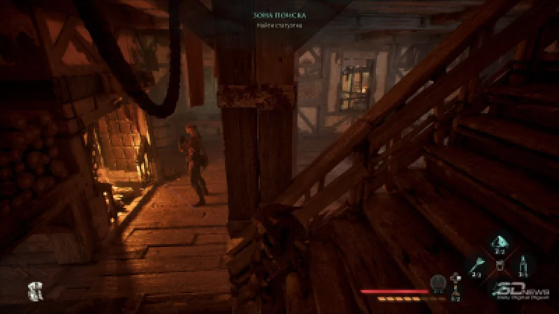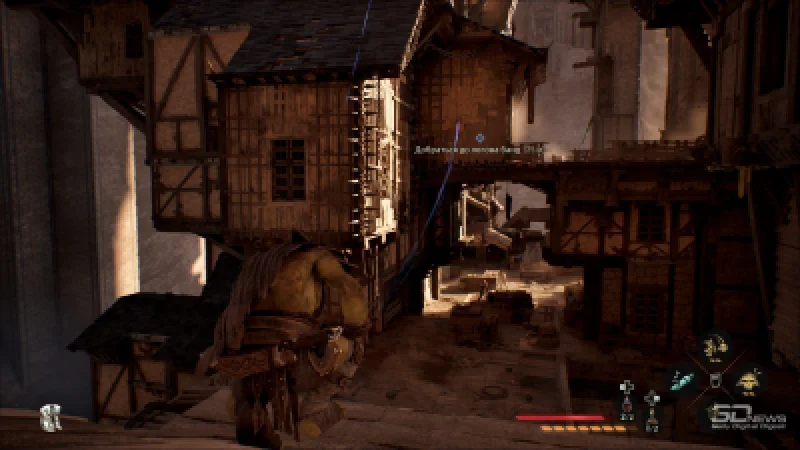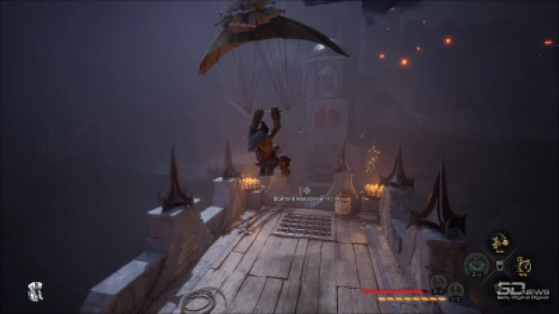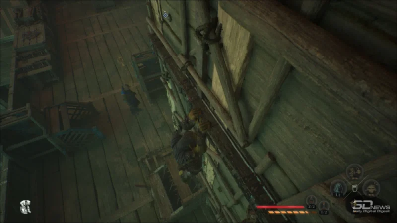 Расширенные границы игрового мира идут на пользу пользователю. Уровни не просто увеличились в площади, но и значительно приподнялись. Особенно впечатляют Крепостная стена и аванпост в орочьих чащах — это многоуровневые пространства с акцентом на вертикальное перемещение, где обширные открытые участки сочетаются со сложными постройками и запутанными подземельями. Акробатические умения приобретают ключевое значение. Стикс проворно хватается за уступы, перекладины и всевозможные канаты. Система паркура сохранила приятную классическую основу: нужно визуально оценивать дистанцию для прыжка и корректировать траекторию в полёте для точного приземления. Каждое действие требует как концентрации, так и осмысленного нажатия кнопки. Никакого автоматического лазания или «помощника» в движении.