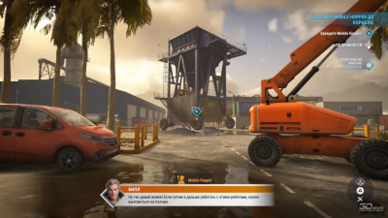 Это далеко не все ключевые изменения, которые выделяют проект среди предшественников — здесь практически всё переосмыслено. Мы не колесим по обширным локациям — вместо этого выбираем контракты в меню, наблюдаем экран загрузки, оказываемся в конкретной точке порта и выполняем одно-два задания, после чего возвращаемся в меню. К примеру, вас могут попросить перевезти из одного места в другое опрокинувшуюся огромную цистерну. Или разгрузить с корабля три контейнера — либо, наоборот, загрузить их. Иногда требуется подцепить прицеп, с помощью крана поместить на него мусор и отвезти в указанное место. На одни заказы уходит пять минут, на другие — двадцать, но в целом с большинством задач удаётся справиться достаточно быстро.