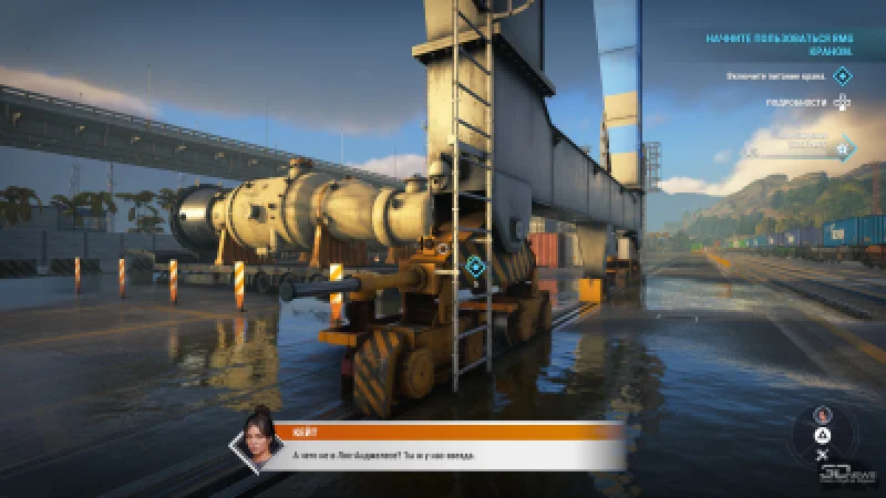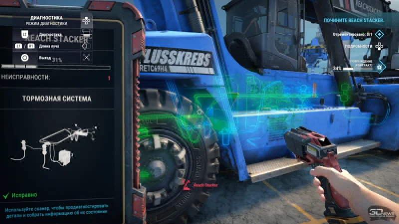 Однако в Docked внедрили чуть больше реализма и интерактивных элементов. В предыдущих симуляторах от Saber персонаж чудесным образом перемещался из одного транспорта в другой, не покидая кабины. Теперь же многие задания начинаются вне техники — вы пешком направляетесь к грузовику, погрузчику или крану, взбираетесь по лестницам, иногда включаете питание, заводите двигатель и лишь затем приступаете к работе. Порой требуется выйти из кабины, вернуться назад и пересесть в другую машину, но чаще доступно обычное переключение между героями, сопровождаемое репликами. Это тоже не революционное новшество (поклонникам жанра вряд ли не хватало подобного), однако без таких деталей данная игра стала бы менее интересной.