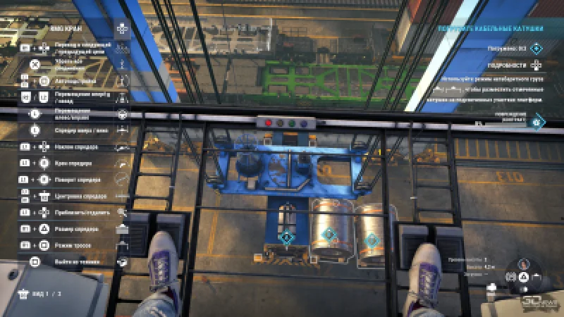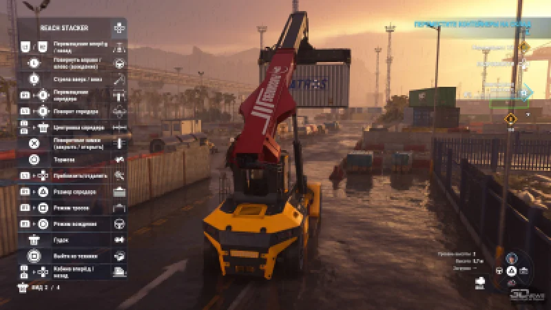 Основные игровые механики здесь связаны именно со спредерами, которыми оснащена почти вся доступная техника: и причальный кран, и ричстакер, и компактный высокий погрузчик, и рельсовый кран. Когда нужно просто поднять контейнер, стоящий удобно, вы перемещаете спредер (или стрелу, на которой он закреплён) и наводите на нужный объект. Немного корректируете положение, вращаете, насколько позволяет конкретная машина, и в нижней части экрана появляется подсказка, показывающая, насколько точно спредер расположен над контейнером. Когда эти всплывающие схемы становятся зелёными, груз можно захватить и спокойно продолжать выполнение задания.