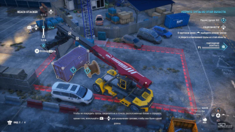 Если же нужный объект лежит на боку, или это не контейнер, а какой-то хлам вроде старых катушек, в ход идут спредеры с тросами — цепляете всё необходимое и перемещаете. Звучит просто, и в основном так и есть, но есть важный нюанс — окружающим объектам и своей технике следует наносить минимальный урон. Если достигнете определённого уровня повреждений — миссия провалена, начинайте сначала. Интересно, что урон учитывается не только для контейнеров с ценным грузом, но и для любого мусора. Например, если вас просят расчистить площадку от хлама — казалось бы, зачем с ним церемониться? Однако нет, его почему-то тоже нельзя повреждать — если начнёте разбрасывать его в стороны, вы приблизите свой провал.