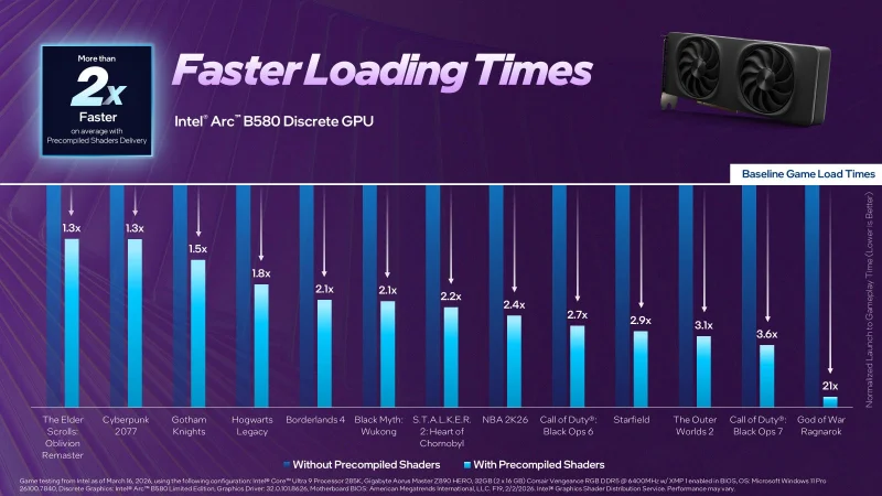 Компания Intel представила обновлённый пакет драйверов 32.0.101.8626 WHQL Game On, включающий сервис распространения предварительно собранных шейдеров (Graphics Shader Distribution Service). По заявлению разработчика, в ряде случаев эта опция способна ускорить первоначальную загрузку игр вплоть до трёх раз для дискретных видеокарт Arc серии B, а также для встроенной графики процессоров Intel Core Ultra второго и третьего поколений.