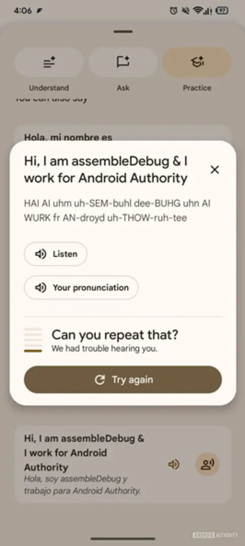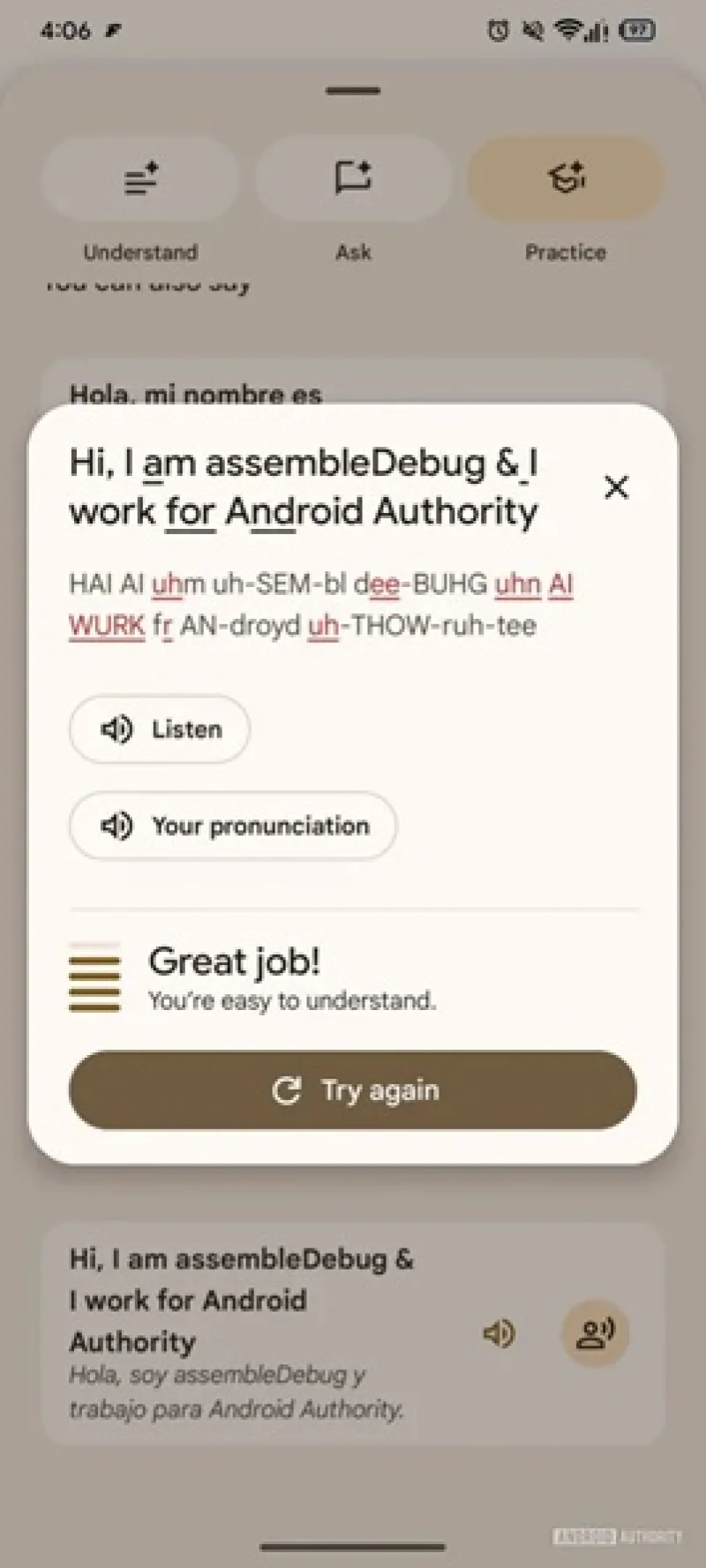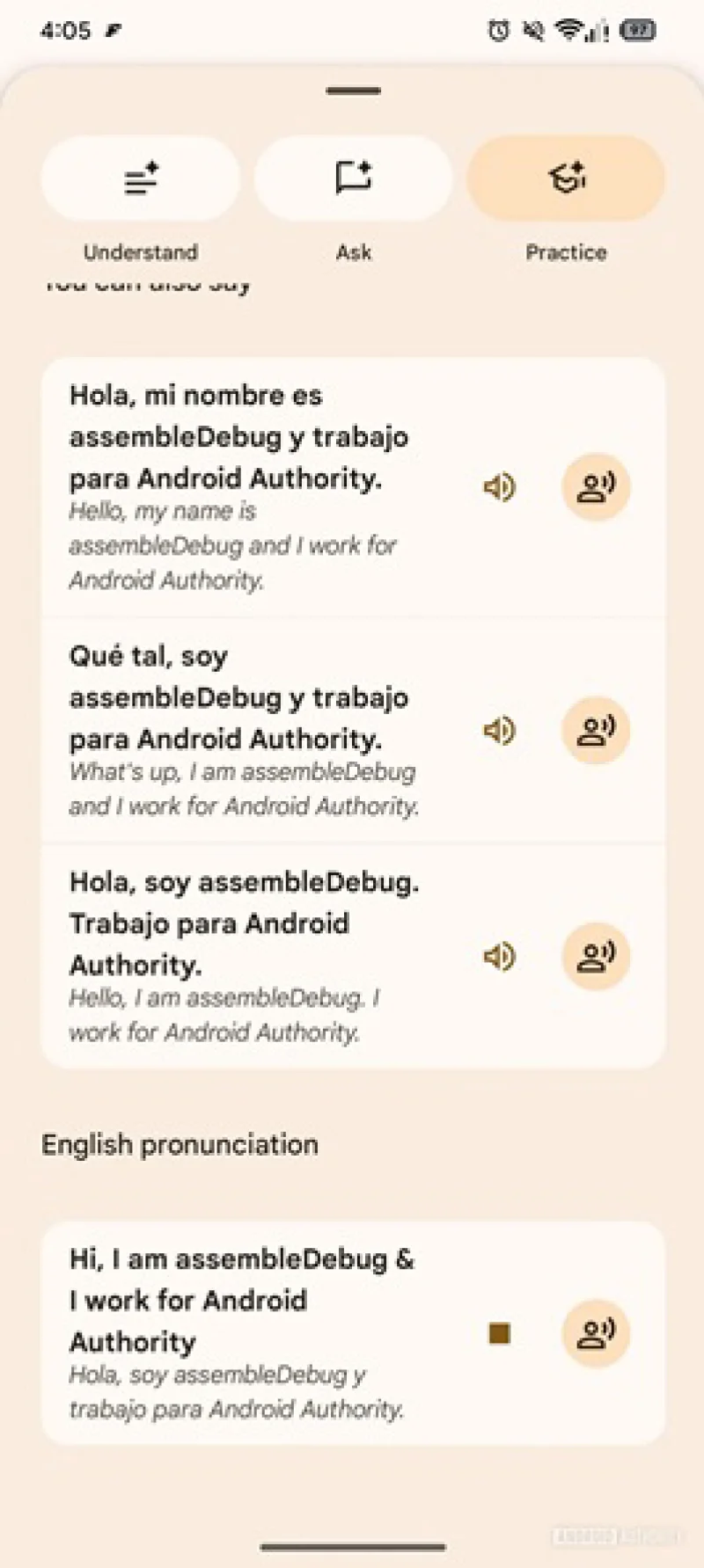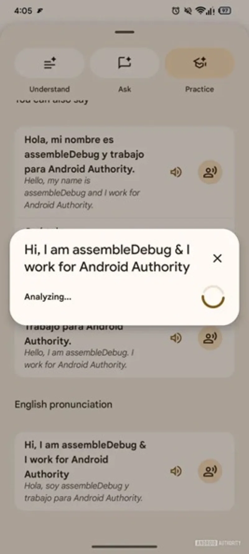 Похоже, что в скором времени в Android-приложение «Google Переводчик» будет внедрён новый режим «Практика», основанный на искусственном интеллекте. Эта функция предназначена для отработки и улучшения произношения.
