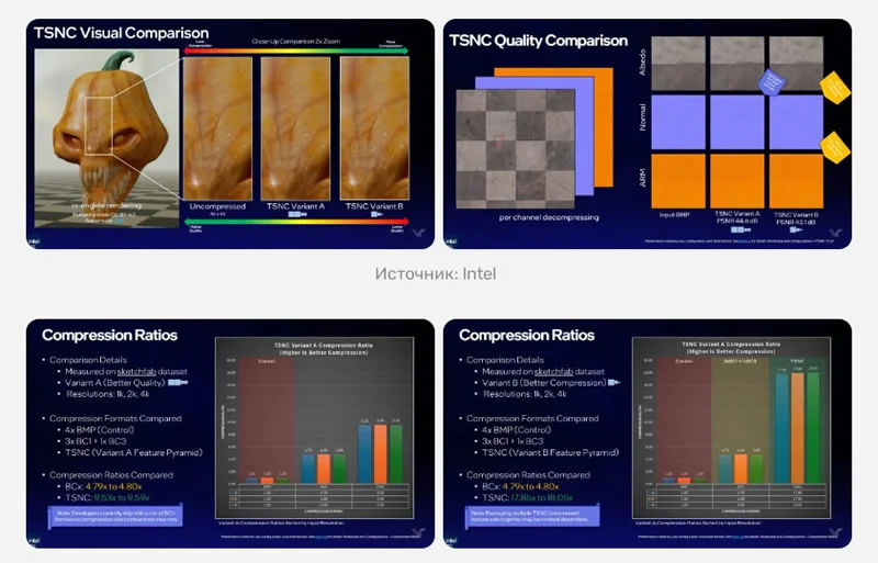 Создатели предложат два режима использования алгоритма: вариант А и вариант B. Первый обеспечивает сжатие более чем в 9 раз с сохранением отличного качества картинки, тогда как второй уменьшает файлы в 18 раз, но с более выраженными визуальными дефектами (к примеру, артефактами на картах нормалей). В основе подхода лежит обучение нейросети совместному кодированию и декодированию набора текстур, что позволяет обойти ограничения стандартного блочного сжатия. При визуальной оценке Intel зафиксировала потерю качества восприятия около 5% для первого режима и 6–7% для второго.