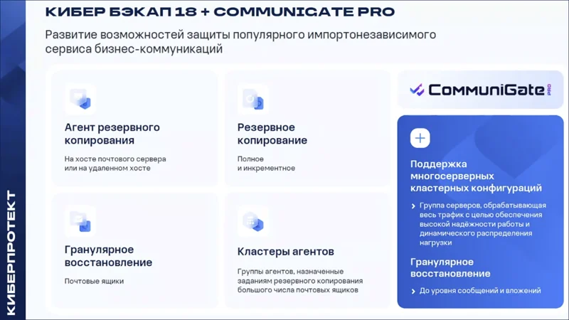 Существенные улучшения затронули инструменты взаимодействия с российской платформой CommuniGate Pro — теперь реализована работа с кластерными конфигурациями на нескольких серверах для масштабных развёртываний коммуникационных служб, включая детализированное восстановление вплоть до почтовых ящиков, электронных писем и прикреплённых файлов. Кроме того, интегрирована защита сервиса Mailion, позволяющая восстанавливать как отдельные почтовые ящики, так и конкретные сообщения в их первоначальное местоположение.