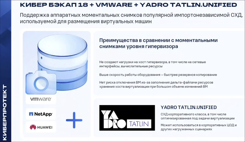 С выходом «Кибер Бэкап» 18.0 перечень поддерживаемых систем виртуализации на уровне гипервизора пополнился Proxmox VE и основанной на ней платформой «Альт Виртуализация». Кроме того, появилась возможность использования аппаратных снапшотов виртуальных машин через систему хранения данных YADRO TATLIN.UNIFIED для окружений VMware.